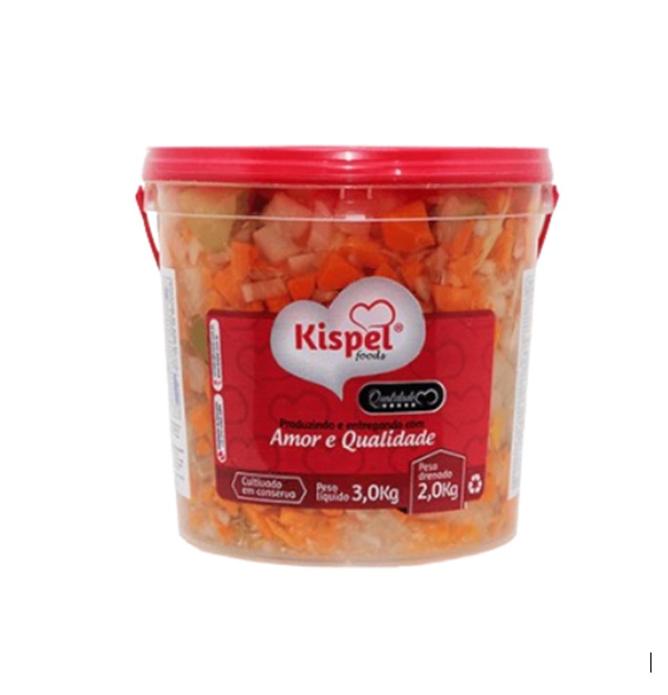 Balde com 3 kg líquido e 2 kg drenado. Legumes: Cenoura, nabo, couve-flor e pepino.